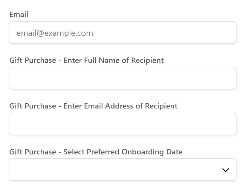 Then, please enter the full name and email address of the gift recipient, together with your preferred onboarding date option, into the respective Gift Purchase fields on the purchase form.